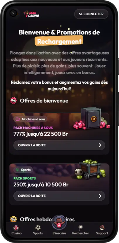 Ces offres exclusives prennent souvent la forme de tours gratuits, de paris gratuits, ou de petits crédits de jeu utilisables sur les machines à sous les plus populaires. Pour y accéder, il suffit de créer un compte et d’effectuer votre MadCasino login. Les bonus sans dépôt peuvent être réclamés via un MadCasino bonus code communiqué par e‑mail ou sur la page des code promo MadCasino. Ces offres en ligne sont limitées dans le temps, il est donc conseillé de vérifier régulièrement la section « Promotions ».